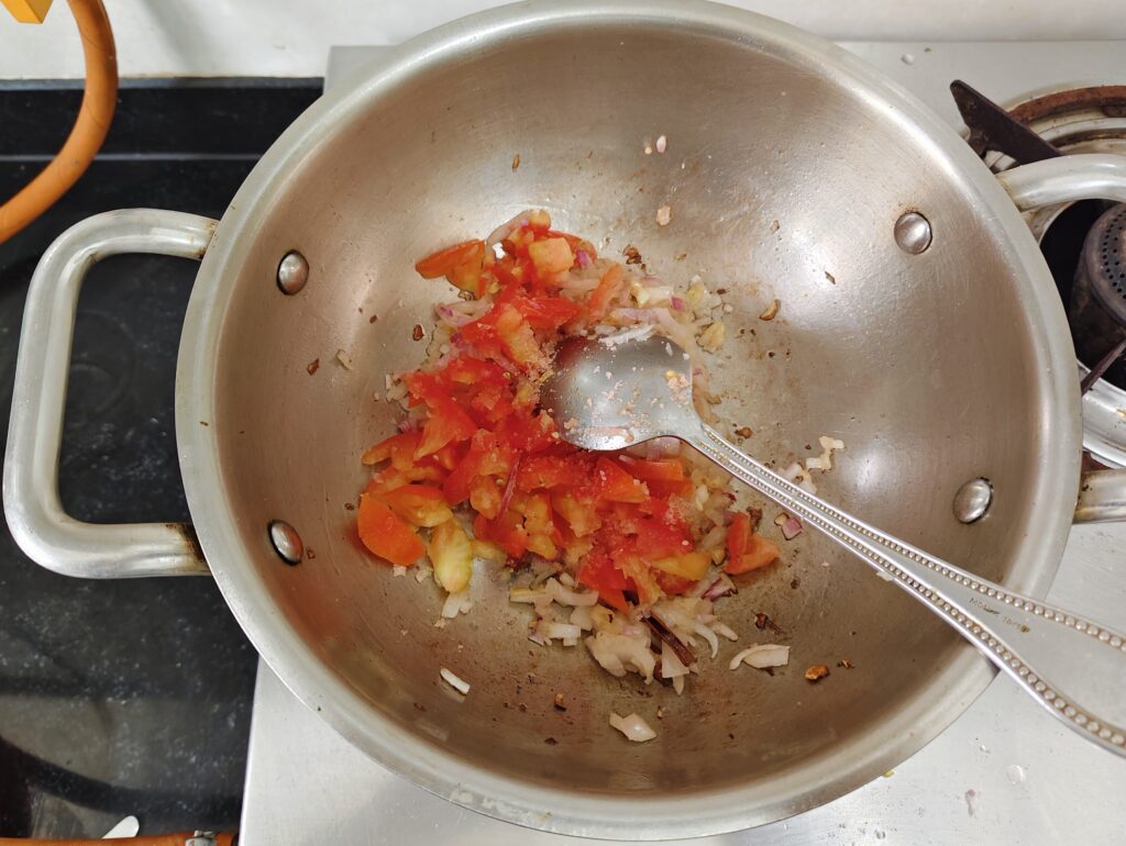 Then add onions and saute it until the onions are translucent. Then add tomatoes and salt and saute again.